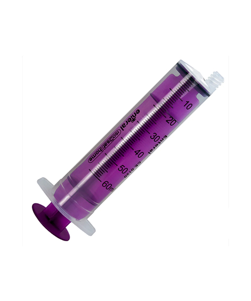 Jeringa enteral 60ml desechable con conexión ENFIT indicada para la entrega de medicación y nutrición enteral formulada, ya sea por vía oral o a través de un tubo de alimentación en el tracto gastrointestinal.